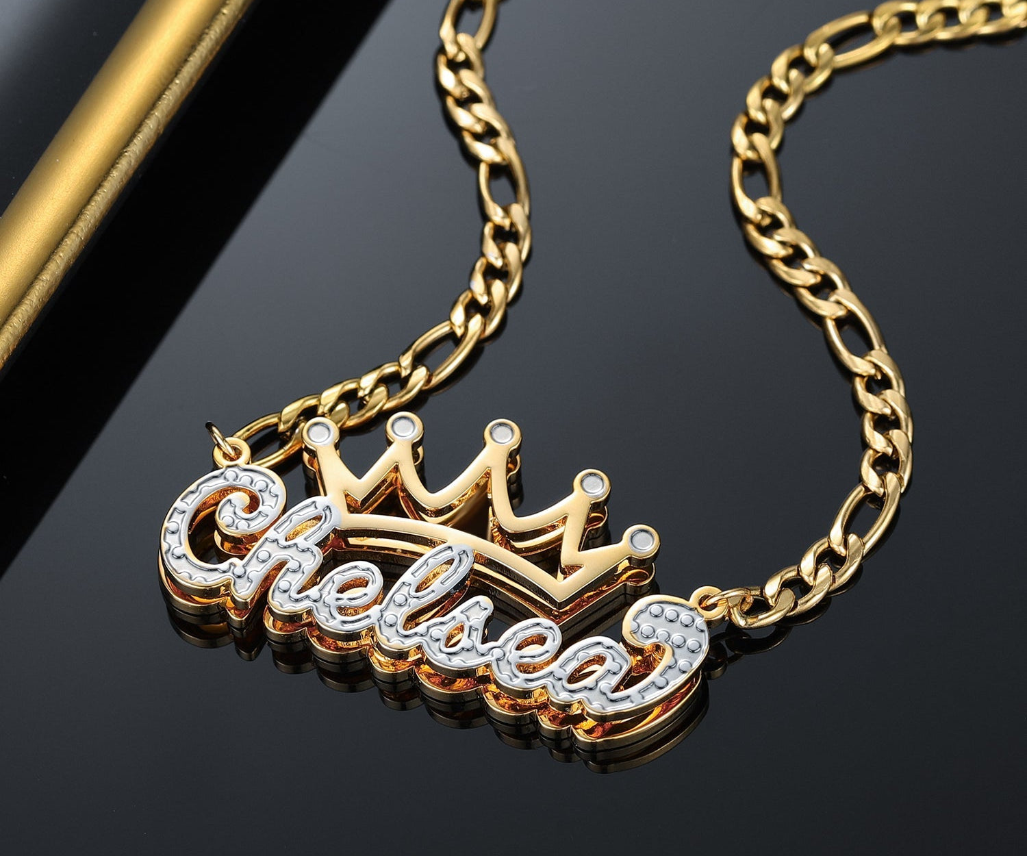 Kids Double Plated Crown Name Necklace w/ Figaro Chain