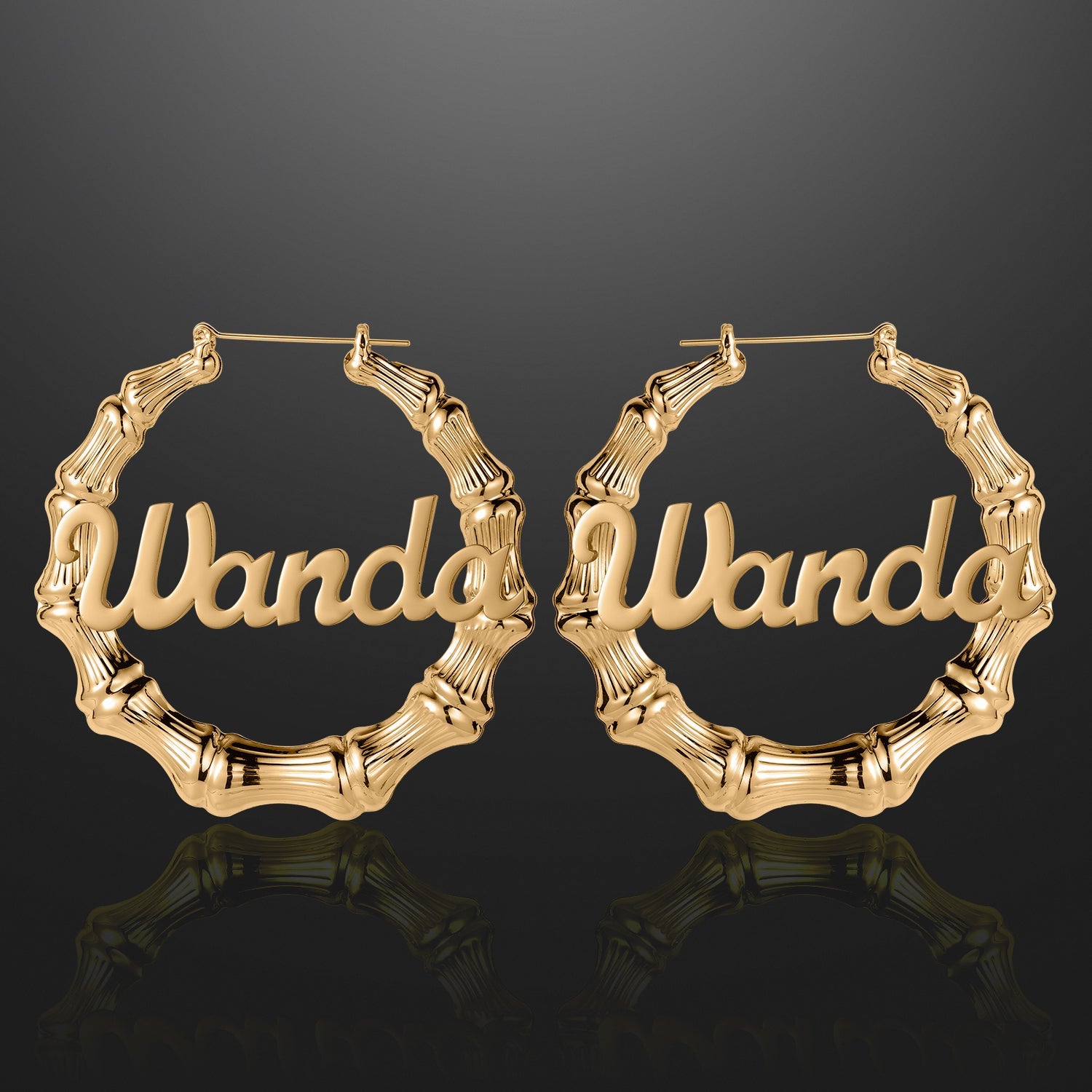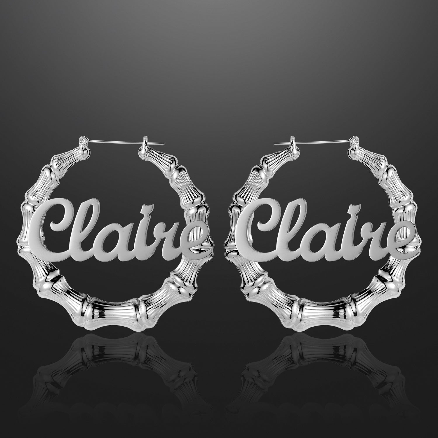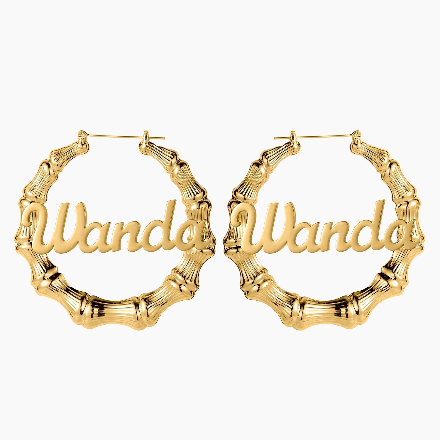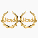 Personalize these bamboo hoop earrings with your name, the name of a loved one, or a special word. Crafted from 18K gold and silver plating, this piece is made to last. The bigger the hoops, the bigger the statement!