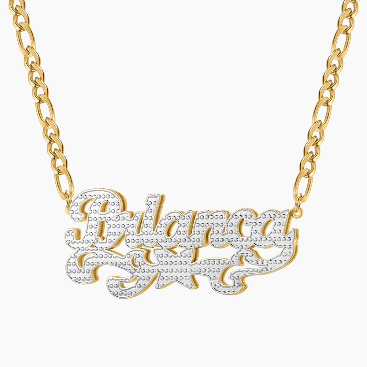 Make a statement with our new double plated collection! Personalize this figaro chain with your name, the name of a loved one, or a special word. Crafted from 18K gold and silver plating, this piece is made to last.