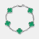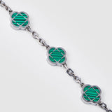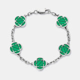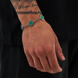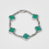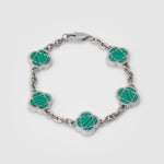 This bracelet features a series of our iconic 4-leaf clover motifs, each framed in silver and set with a deep green inlay. Designed to replicate the depth and richness of natural Malachite, its surface is sealed with a durable, scratch and fade-resistant finish. Beveled oval links ensure a comfortable fit on the wrist, while our snap-proof clasp ensures this piece is truly CRAFTD to last.
