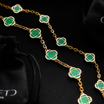 This necklace features a series of our iconic 4-leaf clover motifs, each framed in 18K gold and set with a deep green inlay. Designed to replicate the depth and richness of natural Malachite, each clover is sealed with a durable, scratch and fade-resistant finish. Beveled links offer a seamless fit along the neckline, while our snap-proof clasp ensures this piece is truly CRAFTD to last.