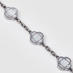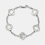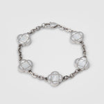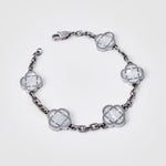This bracelet features a series of our iconic 4-leaf clover motifs, each framed in silver and set with a pearlescent white inlay. Designed to replicate the depth and richness of mother-of-pearl, its surface is sealed with a durable, scratch and fade-resistant finish. Beveled oval links ensure a comfortable fit on the wrist, while our snap-proof clasp ensures this piece is truly CRAFTD to last.